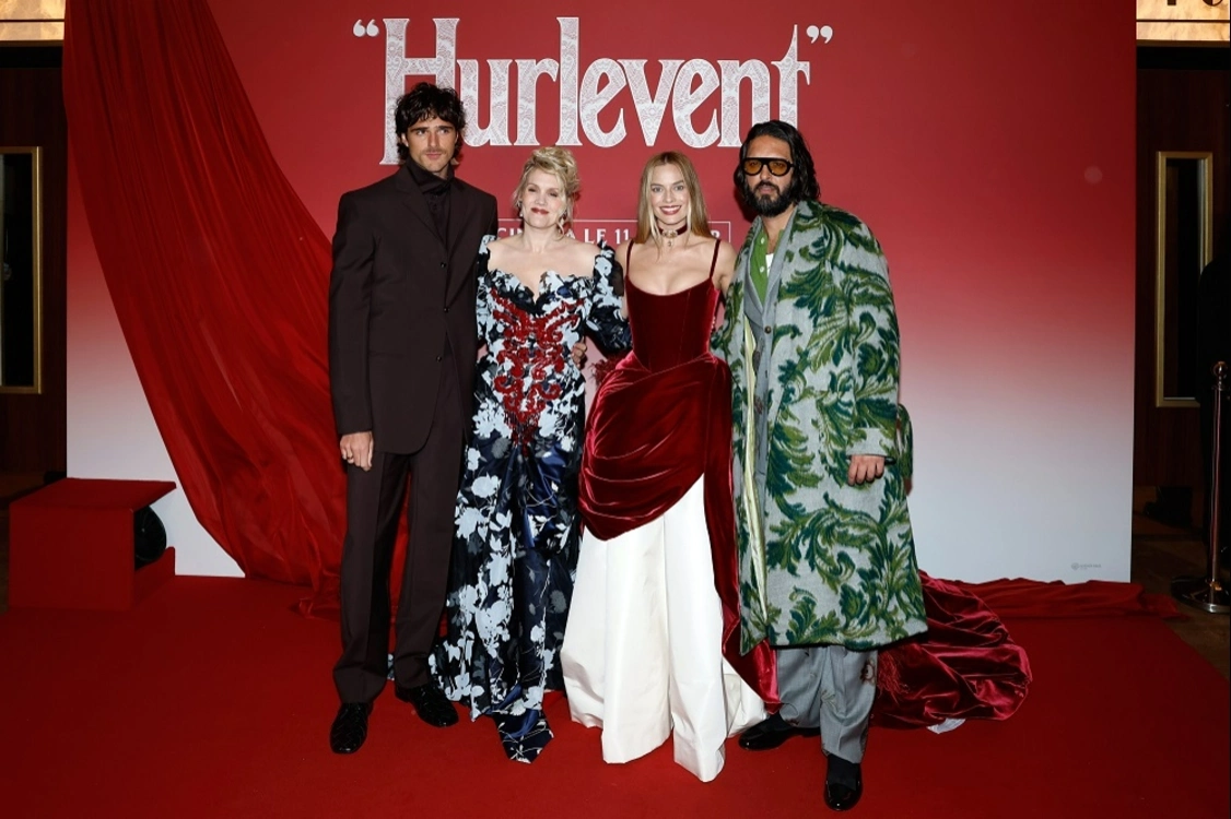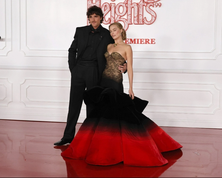 Первое появление дуэта состоялось 28 января в Китайском театре TCL в Лос-Анджелесе. Марго Робби выбрала платье в стиле «русалка»: бежевое бюстье с тонким черным кружевом переходило в бархатную юбку с темно‑красным подолом — намеренная отсылка к мрачной палитре фильма. Волосы, убранные в аккуратный пучок, сместили акцент на винтажное колье «Тадж‑Махал» стоимостью 8 млн долларов с бриллиантом в форме сердца, некогда принадлежавшее Элизабет Тейлор. Образ дополнили бриллиантовые серьги и кольцо с рубином.