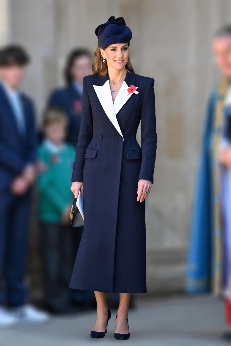 Для выхода принцесса выбрала темно-синее платье-пальто приталенного силуэта, двубортным кроем и контрастными белыми лацканами, к одному из которых был прикреплен красный мак — традиционный символ памяти о павших солдатах.
