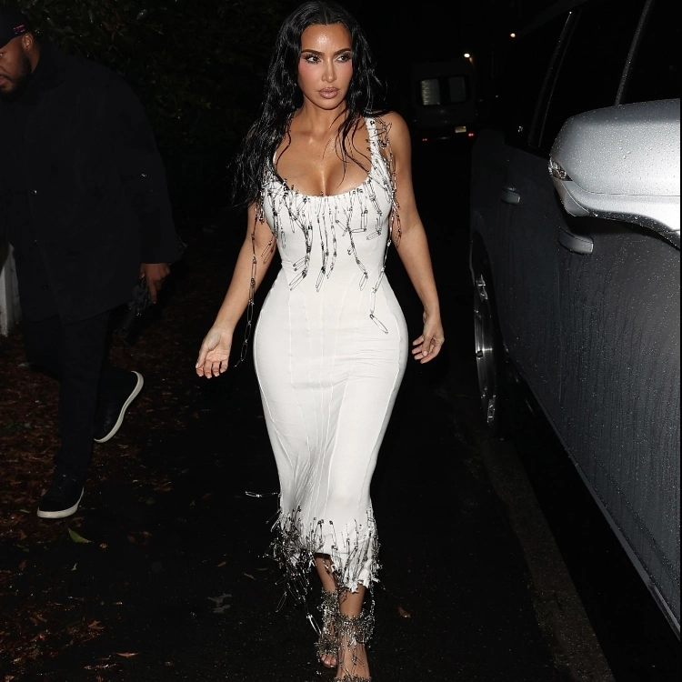 Кардашьян выбрала весьма смелый образ. Звездная мать четверых детей надела белое облегающее платье от бренда Dilara Findikoglu, сообщает Page Six. Его ткань покрывали сотни булавок, а босоножки от Manolo Blahnik с похожим декором дополнили образ Ким.