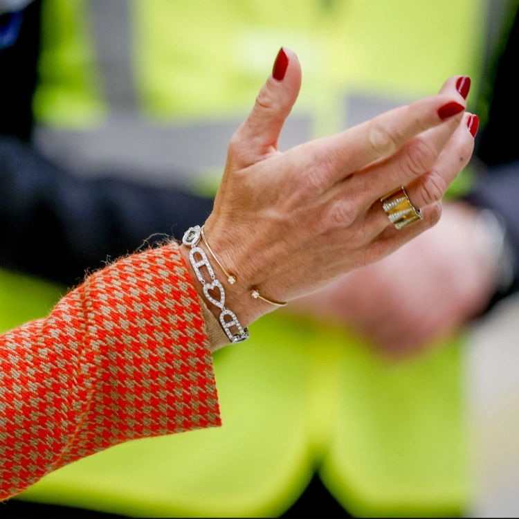 Королева Нидерландов выбрала для визита яркий и запоминающийся наряд: кораллово‑оранжевый костюм‑тройку в «гусиную лапку» от премиального бельгийского бренда Natan. При этом образ дополнили бюджетные сапоги и клатч от Mango, серьги от Olympia Babylonia и браслет от французского ювелирного бренда Dinh Van.