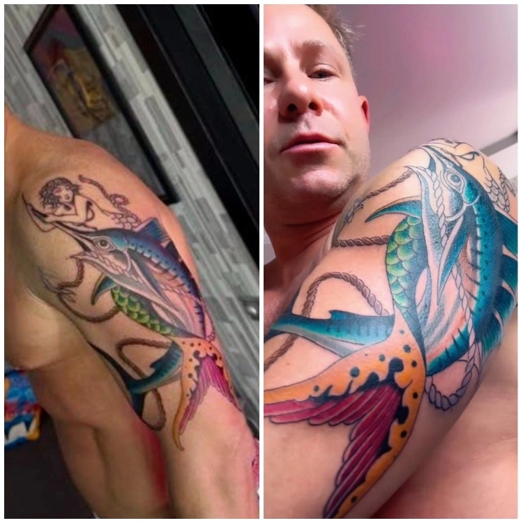 Эскиз оказался не скромным, а довольно масштабным. Цветная композиция заняла всё плечо. Теперь на руке Фомина красуется огромный марлин, которого заарканила русалка.