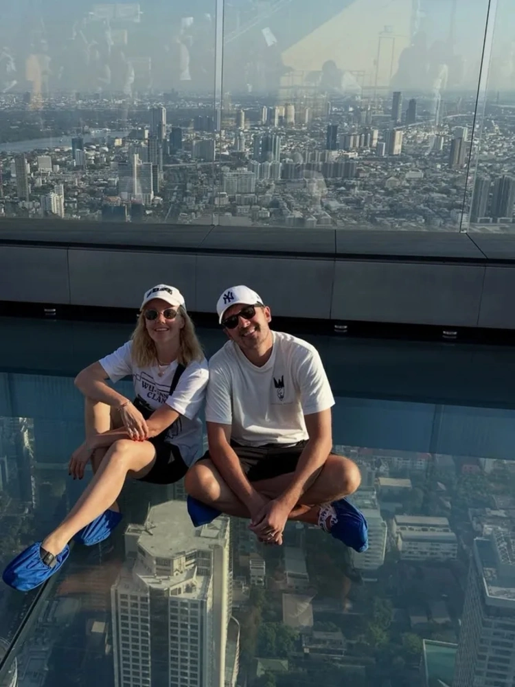 Саунд-продюсер Андрей Черный поздравил супругу отдельной публикацией — редким совместным снимком, на котором пара сидит на зеркальном полу в одинаковых белых кепках и футболках.