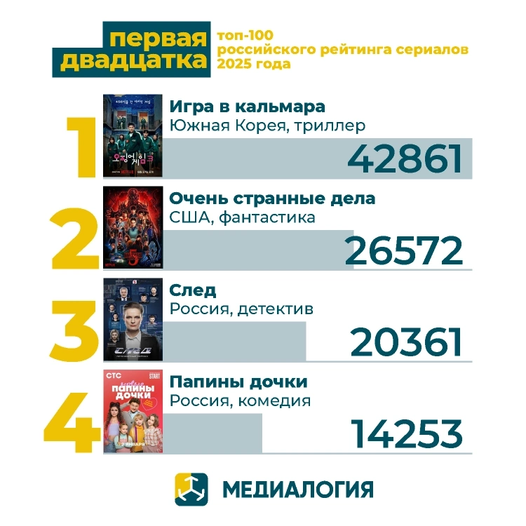 Компания «Медиалогия» представила рейтинг из топ-100 самых популярных сериалов в России за 2025 год.