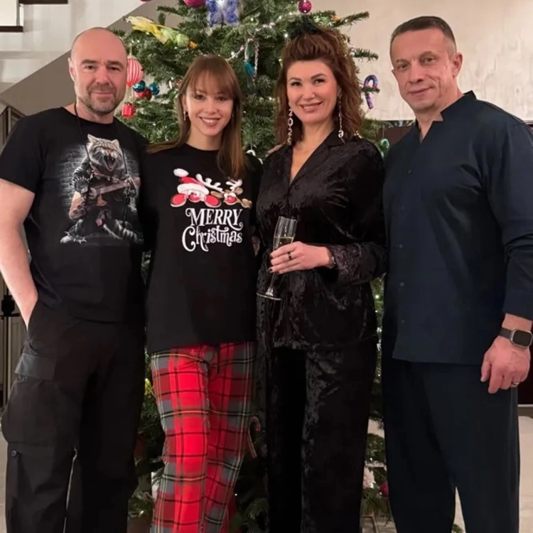 Диброва надела черную футболку с надписью «Счастливого Рождества», красные клетчатые брюки и меховые тапочки, а бизнесмен выбрал полностью черный наряд.