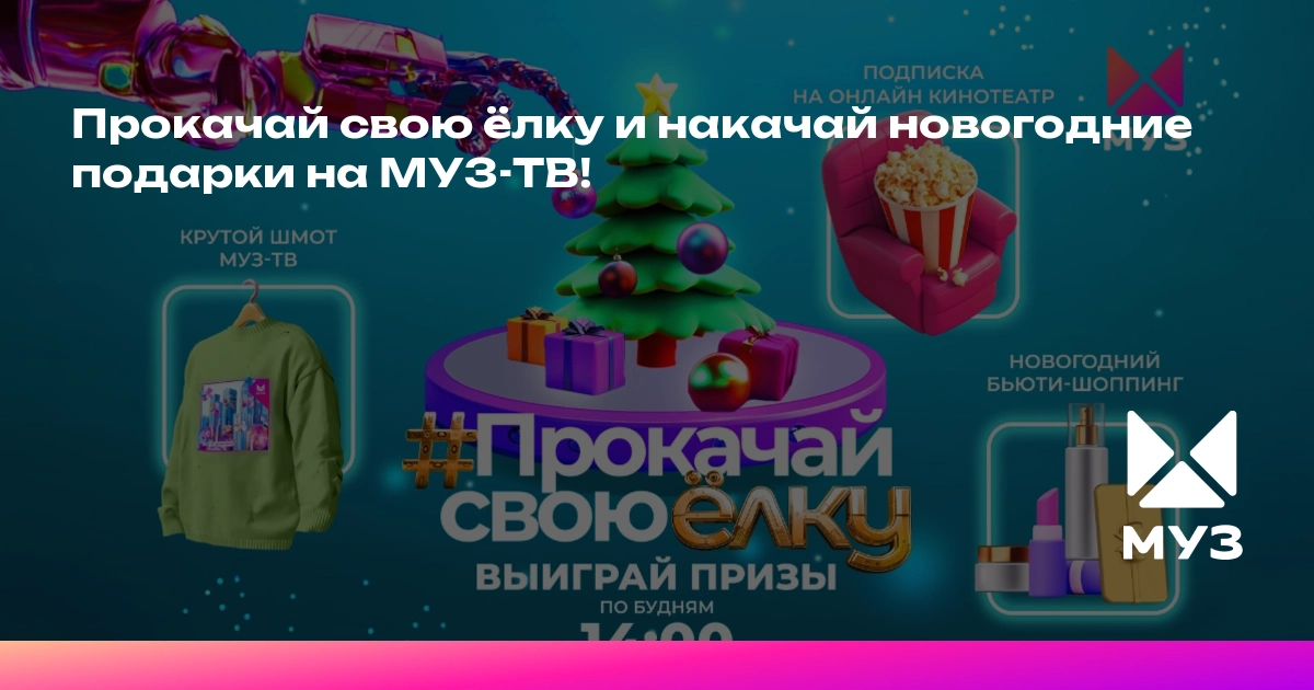 Под Новый год телеканал МУЗ-ТВ исполняет самые заветные желания любимых зрителей! В канун нового года каждый зритель сможет сам нарядить яркую ёлку в прямом эфире и накачать себе роскошные подарки к самому ожидаемому празднику года: поездку на Премию МУЗ-ТВ 2026 на двоих с авиаперелётом и проживанием в шикарном отеле, популярный смартфон, QRутой шмот МУЗ-ТВ для самых крутых модников, новогодний бьюти-шоппинг, а также подписку на онлайн-кинотеатр.