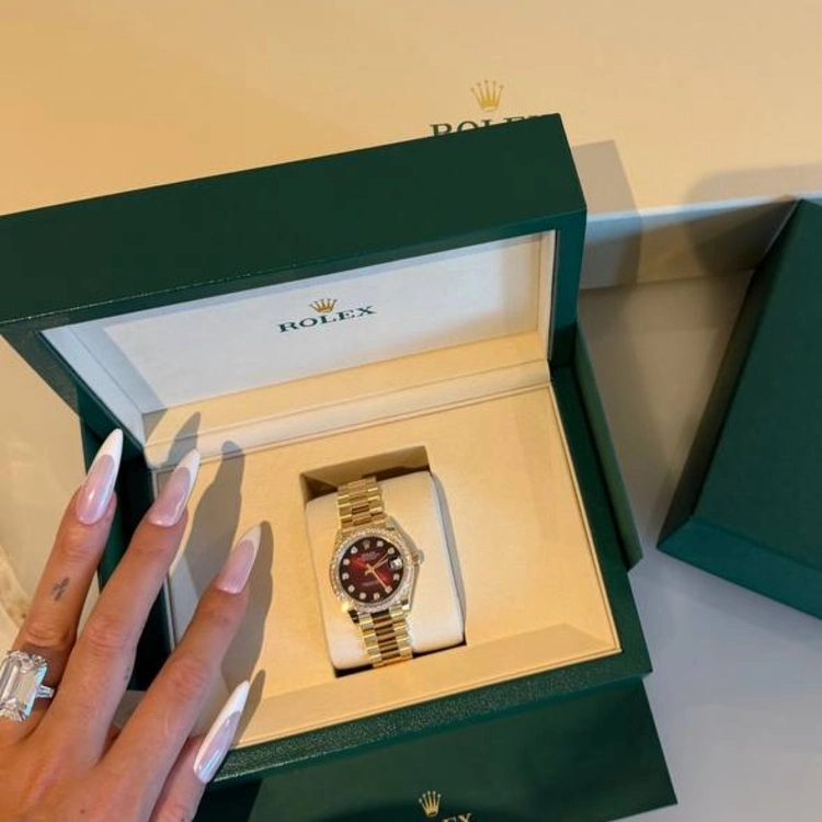 Особенность дорогостоящего подарка в том, что он сделан из желтого золота, а циферблат и ободок дополнены бриллиантами. К тому же это первый циферблат бренда в красном цвете с эффектом омбре. Как пишут Rolex, такое цветовое решение символизирует «солнечный закат, уступающий место сумеркам».