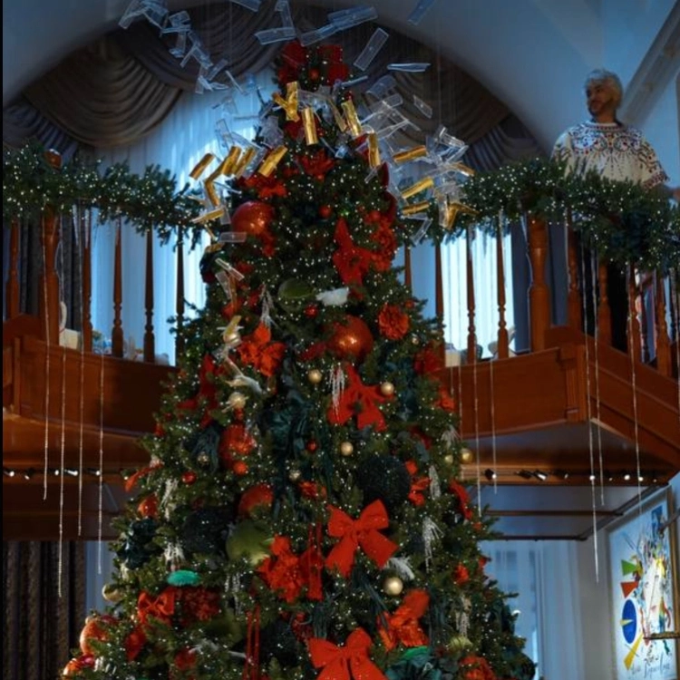 Оформление елки в особняке артиста — продуманная симфония цвета и текстуры. В основе композиции — классическое сочетание зеленого и красного, которое мгновенно пробуждает ощущение настоящего новогоднего волшебства. Визуальную выразительность создают контрастные масштабы украшений: крупные красные шары эффектно соседствуют с более мелкими золотыми, а яркие акценты вносят блестящие цветки пуансеттии. Особую ценность представляют шары со стразами, многие из которых выполнены вручную. Сама пушистая красавица установлена под хрустальной люстрой, подвески которой напоминают снежную вьюгу — как будто пушистая красавица вот‑вот закружится в снежном хороводе. Неординарное решение — минималистичная гирлянда, похожая на капельки, оставшиеся от растаявших снежинок.