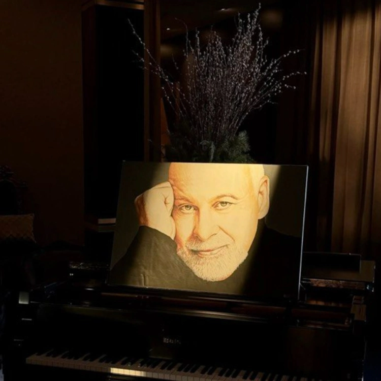 Трогательный текст сопровождается снимком черного рояля, на пюпитре которого установлен портрет Анжелила, куда устремлен солнечный луч. На этом снимке покойный продюсер мягко улыбается и подпирает кулаком голову. Позади портрета стоит букет цветов, похожих на лаванду.