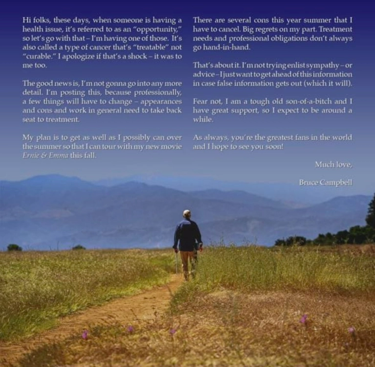 «Привет, ребята! В наши дни, когда у кого-то возникают проблемы со здоровьем, это называют "возможностью", так что давайте так и будем считать — у меня как раз такая возможность. Это также называют разновидностью рака, которая "поддается лечению", а не "излечима". Прошу прощения, если эта новость потрясла вас — меня тоже», — так начал свое обращение Брюс Кэмпбелл.